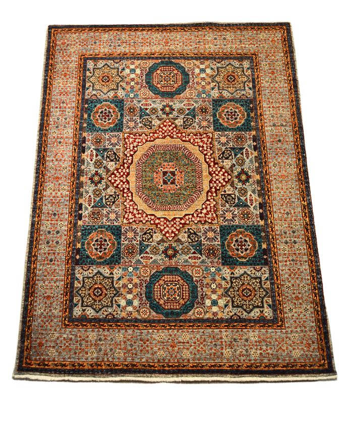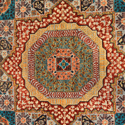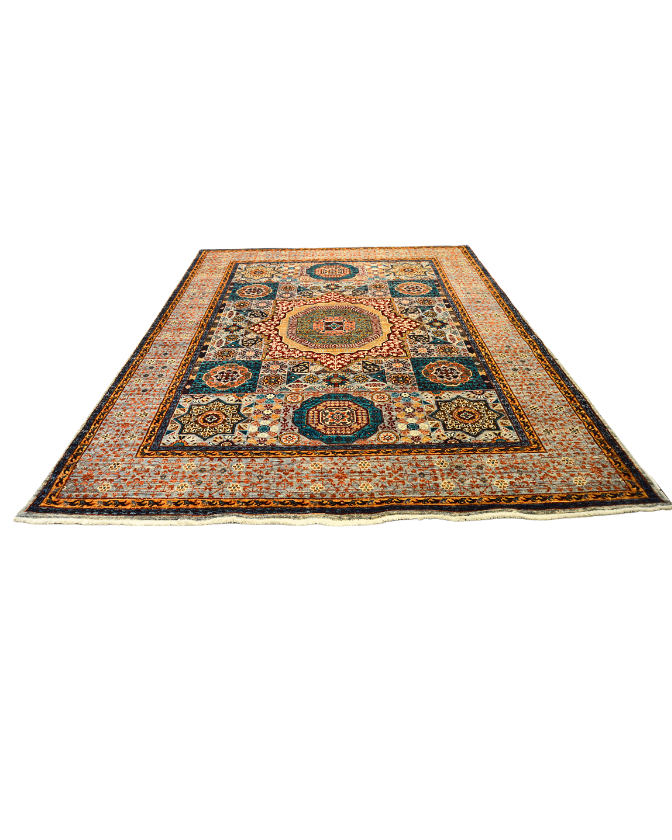 Hand-knotted Afghan Mamluk rugs are meticulously crafted using hand-spun wool dyed with natural vegetable dyes, woven on a sturdy cotton base. This combination ensures vibrant colors, intricate geometric patterns, and exceptional durability.
